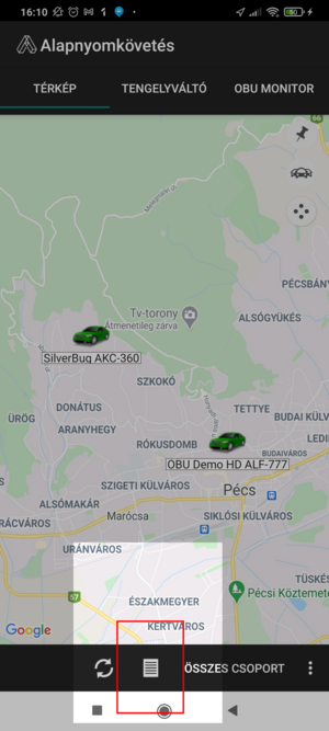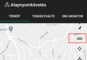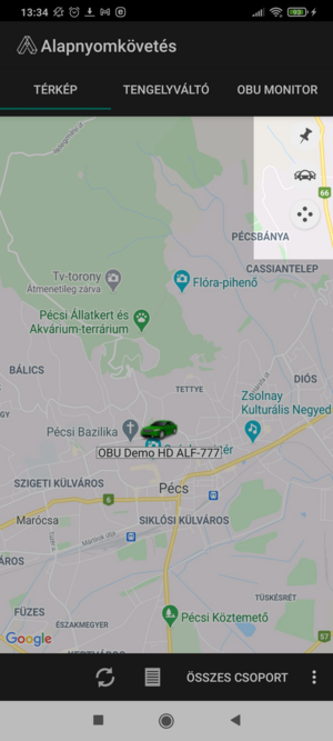 A bejelentkezést követően a térképet tölti be az alkalmazás, de más funkciókból Térkép fülre koppintva navigálhatunk erre a felületre. A térképszelvényen láthatók az ügyfeleink által megfigyelt eszközök. A térképszelvény a betöltéskor úgy fókuszál, hogy az összes megfigyelt eszköz pozíciója látható legyen, de természetesen rá is közelíthetünk egy kiválasztott járműre.