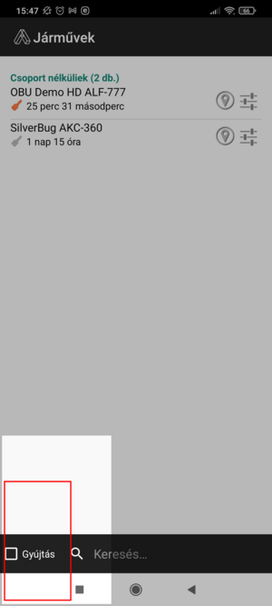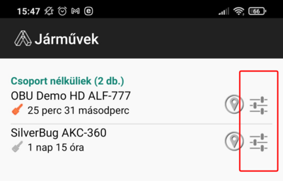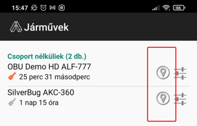 A listában az eszközök mellett megjelenik az utolsó adatbeküldés időpontja óta eltelt idő, valamint egy kulcs piktogram jelzi hogy az eszköz utolsó adatküldésekor gyújtáson volt-e a jármű, vagy sem.
