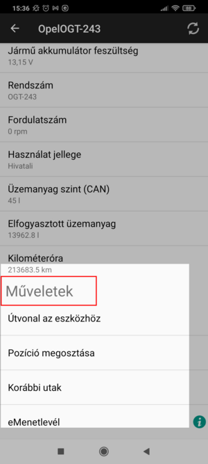 Az eredmény betöltésekor az útszakaszok listája jelenik meg. A fejlécben a Jármű információk gomb található, ide koppintva megjelennek a webes felületen rögzített információk, alatta a lekérdezés teljes időtartama alatt megtett útvonalakra vonatkozó információk helyezkednek el. Ezután következik a vizsgált időszak alatt megtett szakaszok listája.