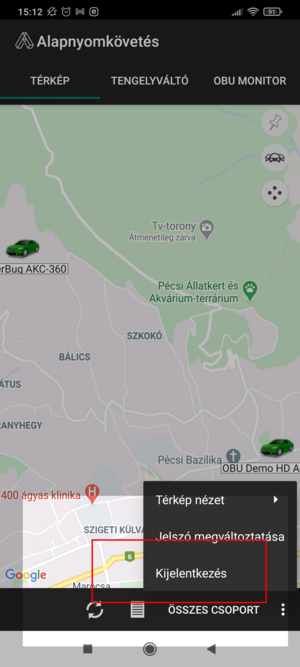 Az alsó menüsor utolsó eleme a kontext menü, amelyben három funkció, a térkép stílus választó, a jelszó változtatás, és a kilépés található.