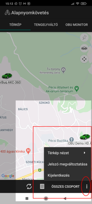 A menü legfelső opciója a Térkép nézet választó. A webes felülettel megegyező módon a Google térkép használata a mobil alkalmazásban is jogosultság függő. Google jogosultság nélkül, alapértelmezetten az OSM térkép használatát biztosítjuk ügyfeleinknek, a jogosultság birtokában viszont három megjelenítés áll rendelkezésre: Térkép (alapértelmezett), Műhold és Hibrid.