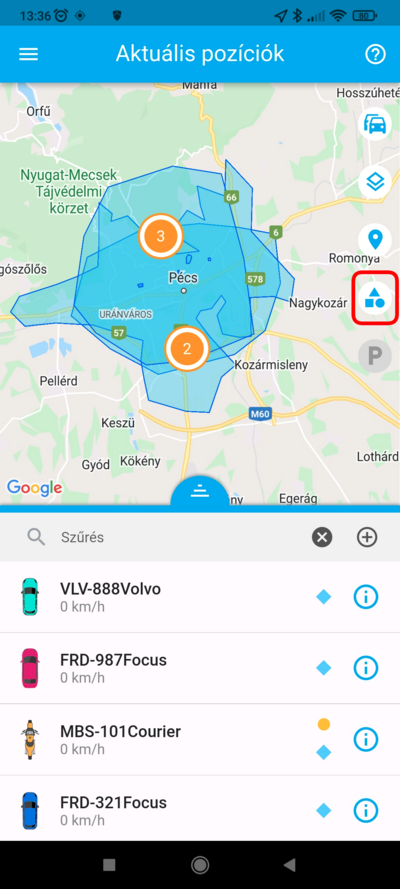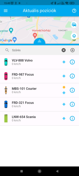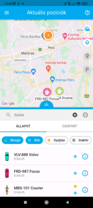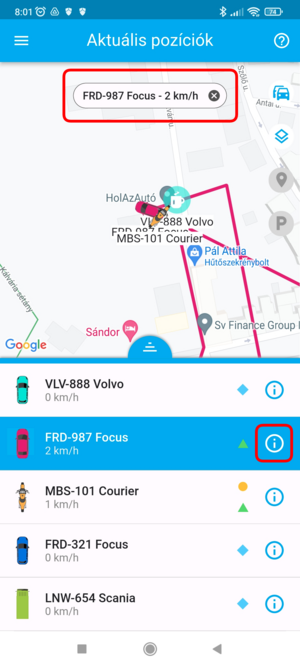 Ha egy adott eszköz pozíciójára vagy kíváncsi, a listában koppints rá, ekkor a térkép az eszközt fókuszba helyezi, és ráközelít. Ezzel egyidőben az eszköz fölött megjelenik a nevet tartalmazó címke, amely mozgás esetén a pillanatnyi sebességet is tartalmazza. Ilyenkor a térkép követő módba kapcsol, a kiválasztott eszközt mozgás közben fókuszban tartja.