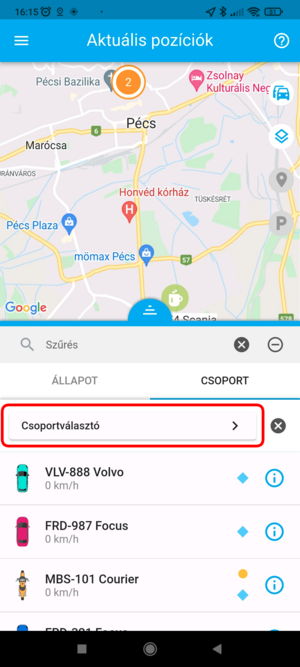 A jobb oldali fülön a webes felületen beállított csoportok használatával szűkítheted a megjelenített eszközök körét. A csoportok között a Csoportválasztó gombra koppintva válogathatsz, az általad megtekinteni kívánt csoportra bökve a lista és a térkép is az adott csoportba tartozó eszözöket jeleníti meg. A csoport kiválasztást az X gombbal törölheted.