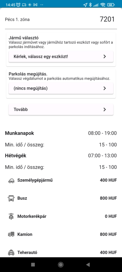A panelt feljebb húzva, jelennek meg a parkolózónára vonatkozó tudnivalók, a díjköteles időszakok és a díjszabási információk.
