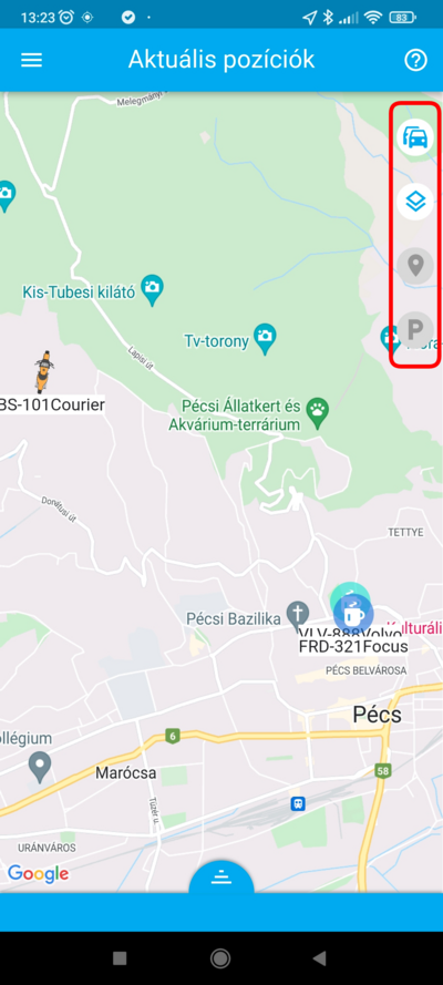 A térképes felület használatát segítő funkciók közül a kicsinyítést és nagyítást, valamint a térkép mozgatását az ismert térképes alkalmazásokkal megegyezően, ujjmozdulatokkal tudod vezérelni. A további funkciók gombjai a térkép jobb szélén, felülről lefelé sorban a következők: