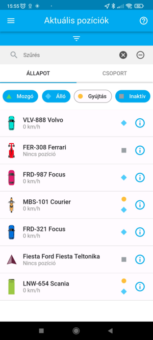 A bal oldali fülön állapot alapján, tehát a mozgó, álló, illetve inaktív állapotokra szűrhetsz, és a gyújtás jel állapota alapján is rendezheted az eszközeid. Az állapotokat színkóddal is elláttuk, a jobb áttekinthetőség érdekében. A gyújtás szűrést aktiválva a többi feltétel automatikusan kikapcsol, tehát csak a gyújtáson lévő járművek jelennek meg. Ezt követően természetesen újra bekapcsolhatod a a többi szűrési szempontot is.