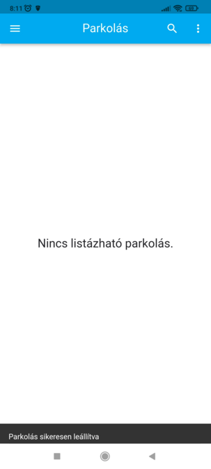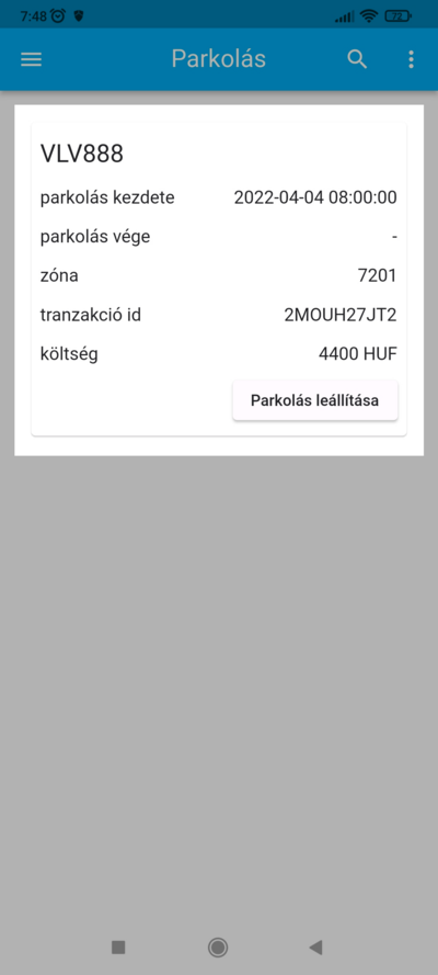A parkolás lezárásához koppints az erre szolgáló gombra, a megnyíló ablakban megjelenítjük a parkolás részleteit. A folyamatban lévő parkolások aktuális összegét nem jelenítjük meg, viszont a parkolás lezárásakor a fizetendő összeget jelezzük. A Parkolás lezárása gombra nyomva a rendszer lezárja a parkolást.