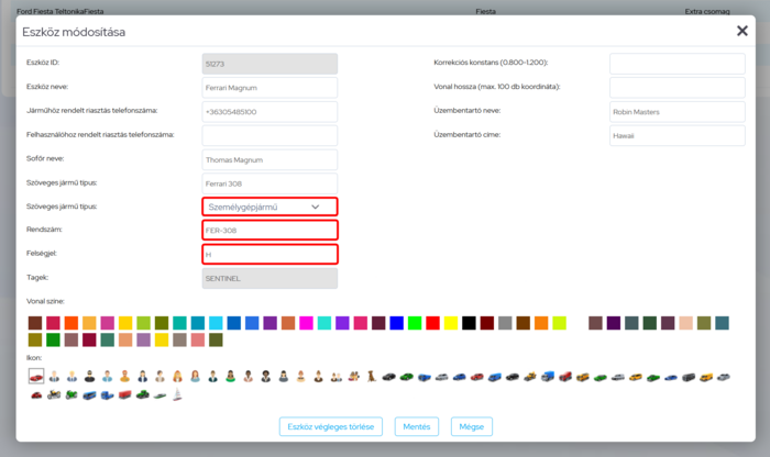 Az online parkolás funkció használatához a webes felületen az eszköz adatlapon a következő adatokat szükséges helyesen kitölteni: