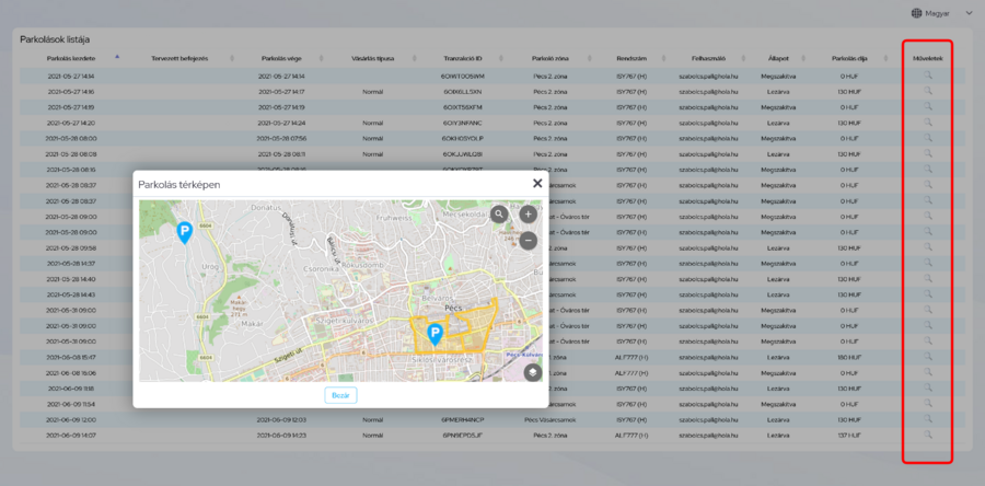 Minden parkolási bejegyzés jobb szélén található egy nagyító ikonnal megjelenő gomb. A gombra kattintva megnyílik a parkolás térképes nézete, amelyben a parkoló jármű helyzetét egy kék, P betűvel jelzett bója mutatja.
