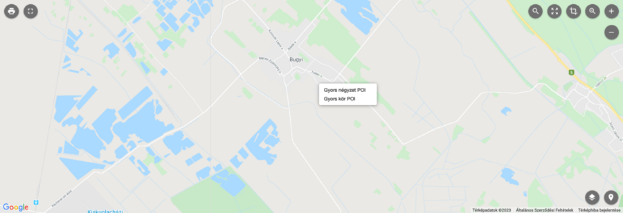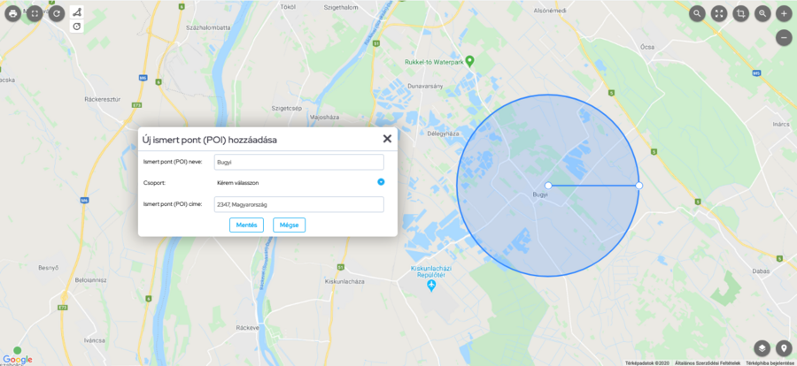 Ismert pontok (POI-k) rögzíthetők az alkalmazásban bármely menü térképes felületén. Jobb egérgomb kattintásra nyílik meg az ablak, amelyben kezdeményezhető kör, vagy poligon (sokszög) típusú POI létrehozása.